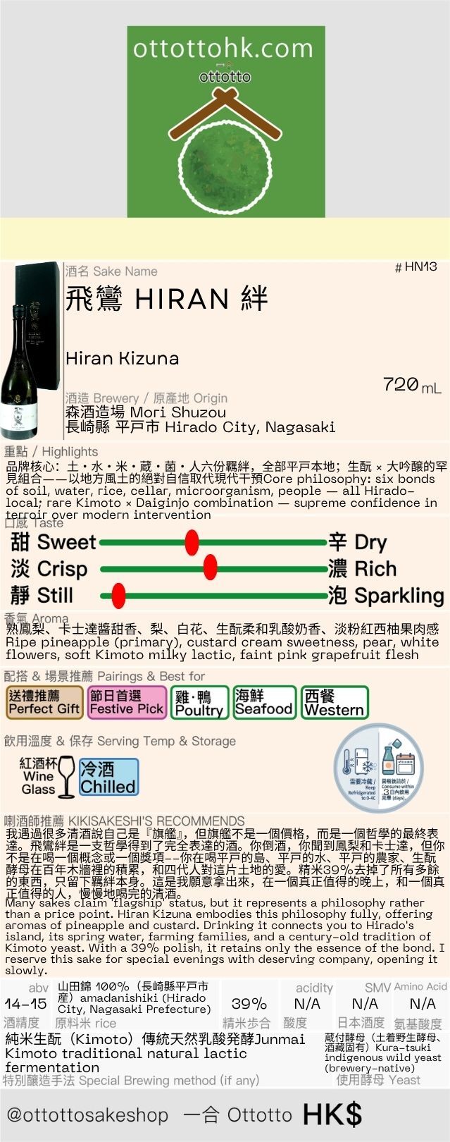 飛鸞 HIRAN 絆 Kizuna 純米大吟醸 720ml|旗艦長崎平戸生酛清酒|森酒造場|附化粧禮盒