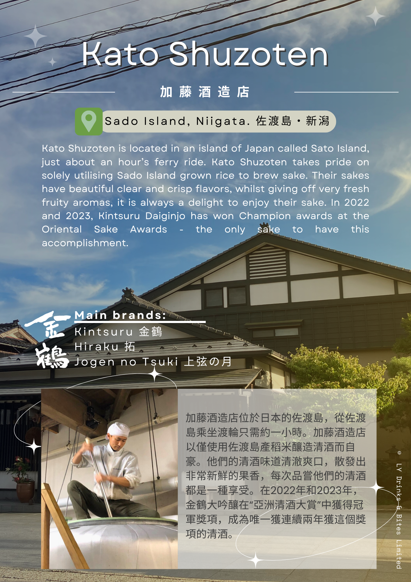加藤酒造店位於日本的佐渡島,乘坐渡輪大約一個小時即可到達。加藤酒造店100%只用佐渡島產的稻米釀造清澈爽口的清酒而自豪。他們的清酒口感清新,風味純淨散發出濃郁的果香,品嘗他們的清酒總是一種享受。在2022年和2023年,金鶴大吟釀在“亞洲清酒大賞2022 & 2023”中獲得了冠軍獎,成為唯一獲得此殊榮的清酒。