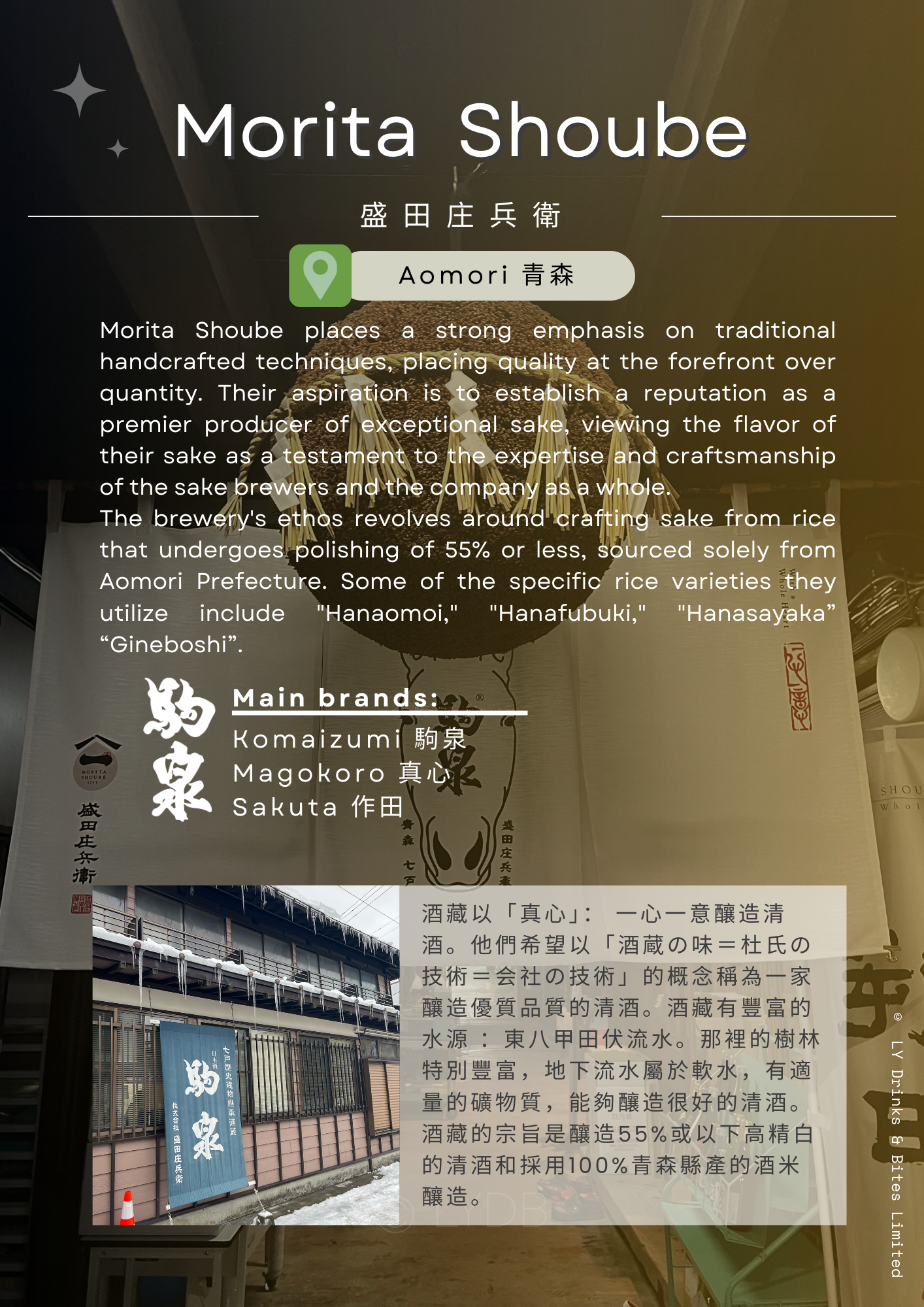 Morita Shoube places a strong emphasis on traditional handcrafted techniques, placing quality at the forefront over quantity. Their aspiration is to establish a reputation as a premier producer of exceptional sake, viewing the flavor of their sake as a testament to the expertise and craftsmanship of the sake brewers and the company as a whole.