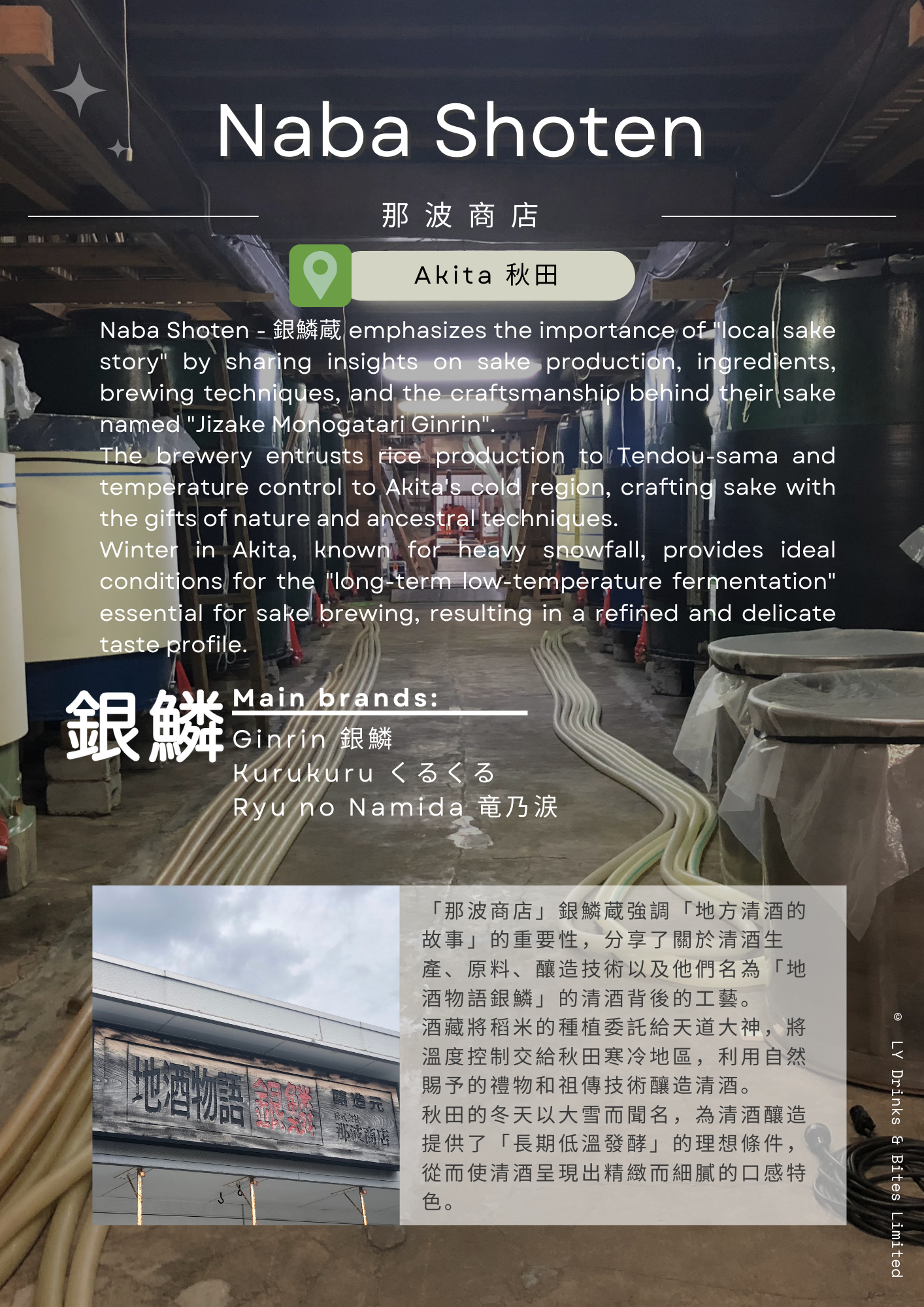 Naba Shoten - 銀鱗蔵 emphasizes the importance of "local sake story" by sharing insights on sake production, ingredients, brewing techniques, and the craftsmanship behind their sake named "Jizake Monogatari Ginrin".