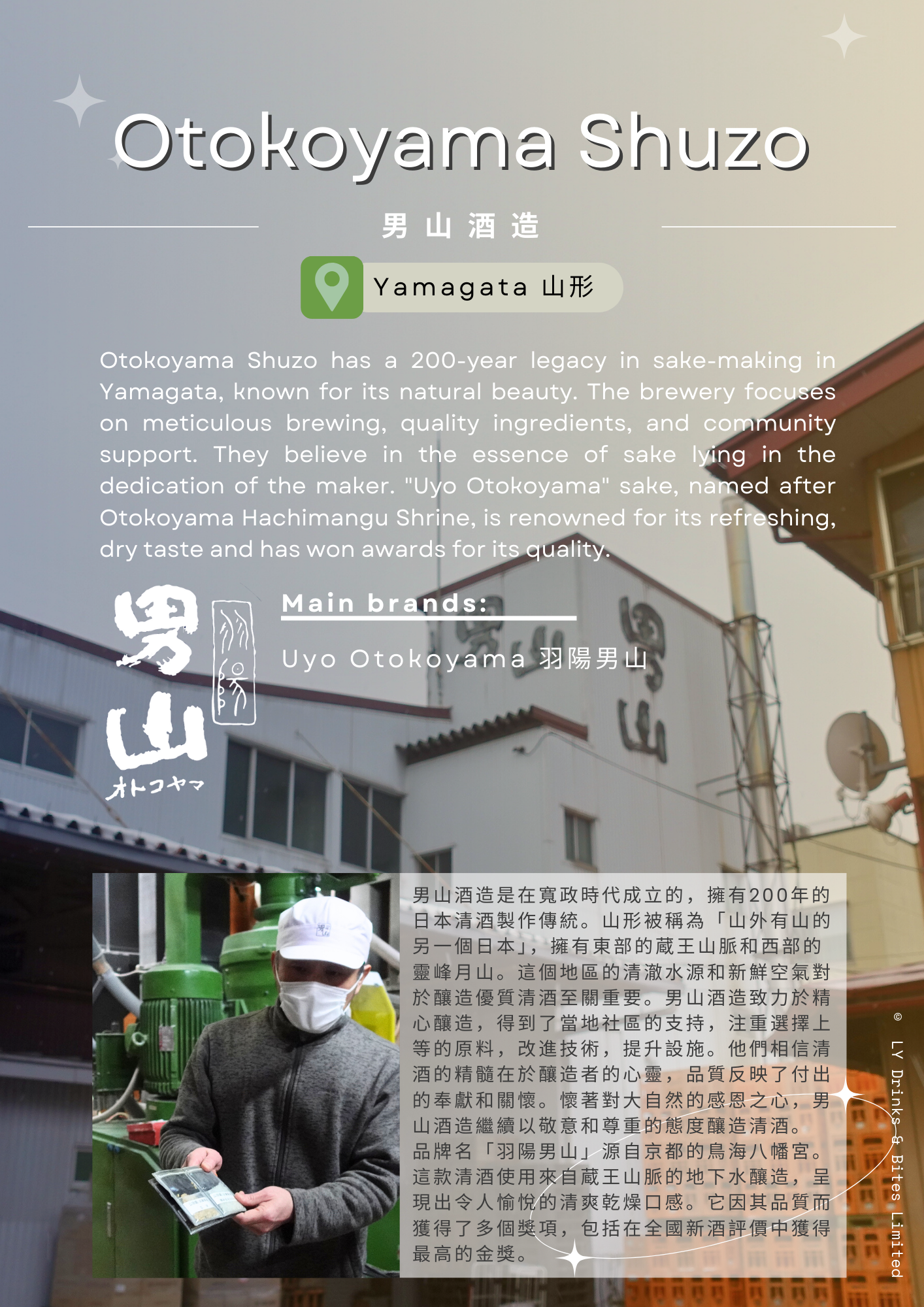 The brand name "Uyo Otokoyama" is derived from Otokoyama Hachimangu Shrine in Kyoto. The sake crafted with underground water from the Zao Mountains offers a refreshing and dry taste that is highly enjoyable. It has received accolades for its quality, including earning the highest gold award at the National New Sake Appraisal.