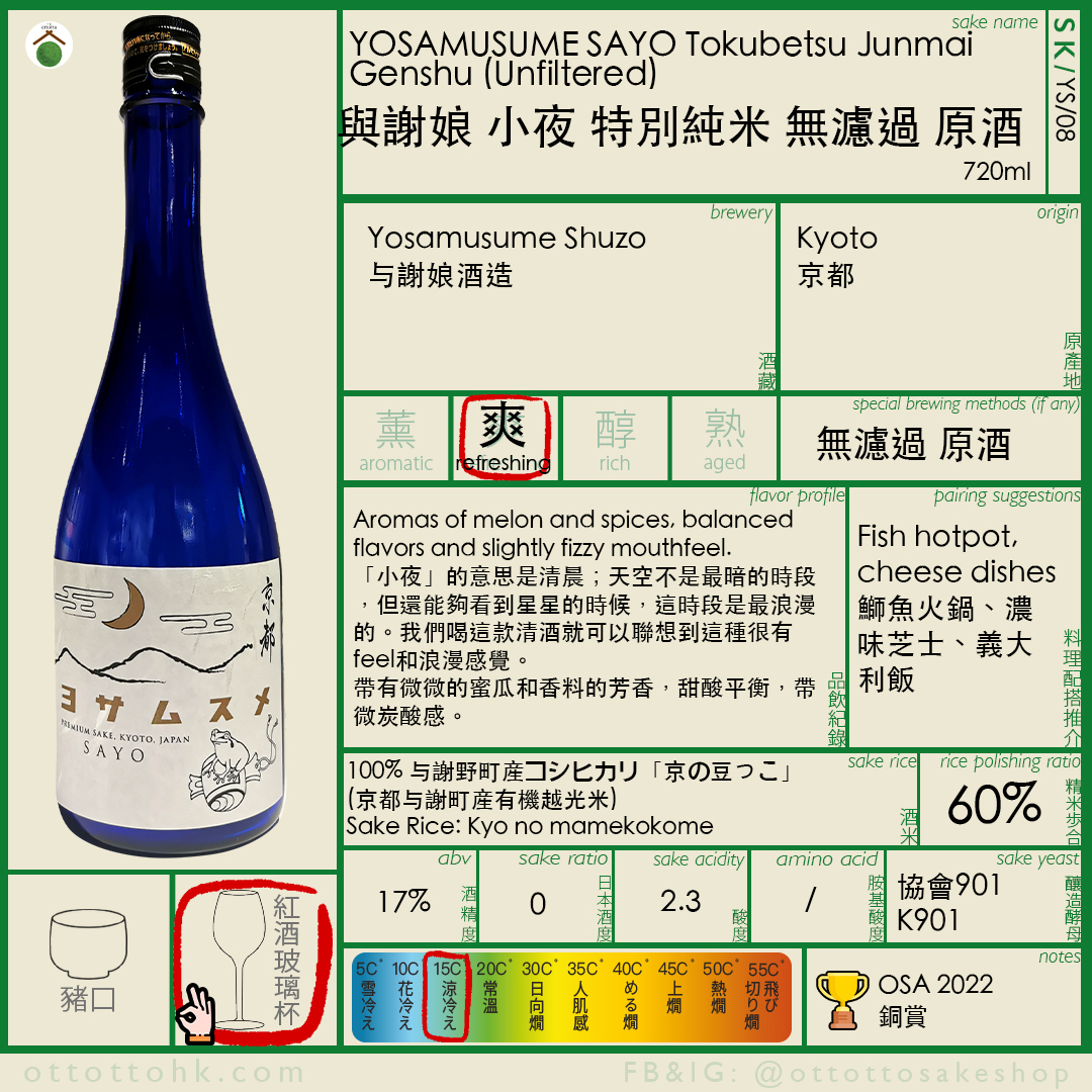 「小夜」的意思是清晨;天空不是最暗的時段,但還能夠看到星星的時候,這時段是最浪漫的。我們喝這款清酒就可以聯想到這種很有feel和浪漫感覺。