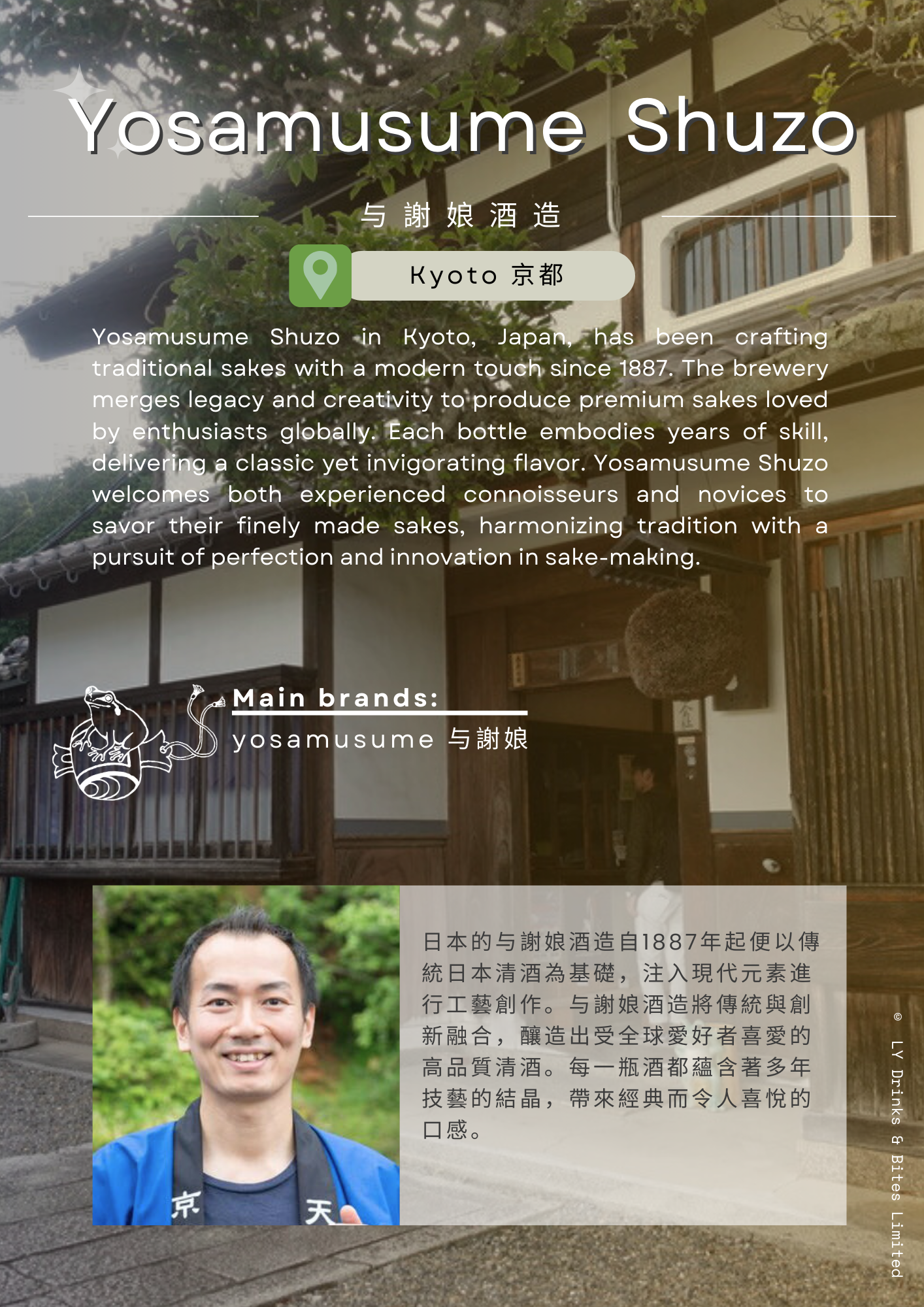 Yosamusume Shuzo in Kyoto, Japan, has been crafting traditional sakes with a modern touch since 1887. The brewery merges legacy and creativity to produce premium sakes loved by enthusiasts globally. Each bottle embodies years of skill, delivering a classic yet invigorating flavor. Yosamusume Shuzo welcomes both experienced connoisseurs and novices to savor their finely made sakes, harmonizing tradition with a pursuit of perfection and innovation in sake-making.